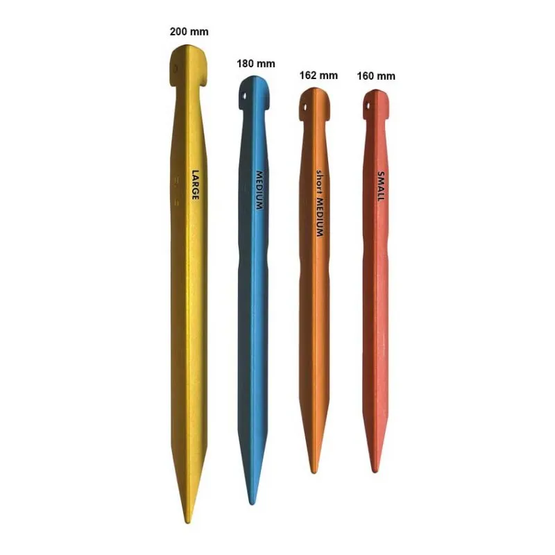 DAC V-Best stakes are available in four distinct sizes, each optimized for different applications and soil conditions. The sizing system reflects decades of research into optimal stake dimensions for various camping scenarios, from ultralight solo backpacking to family car camping.