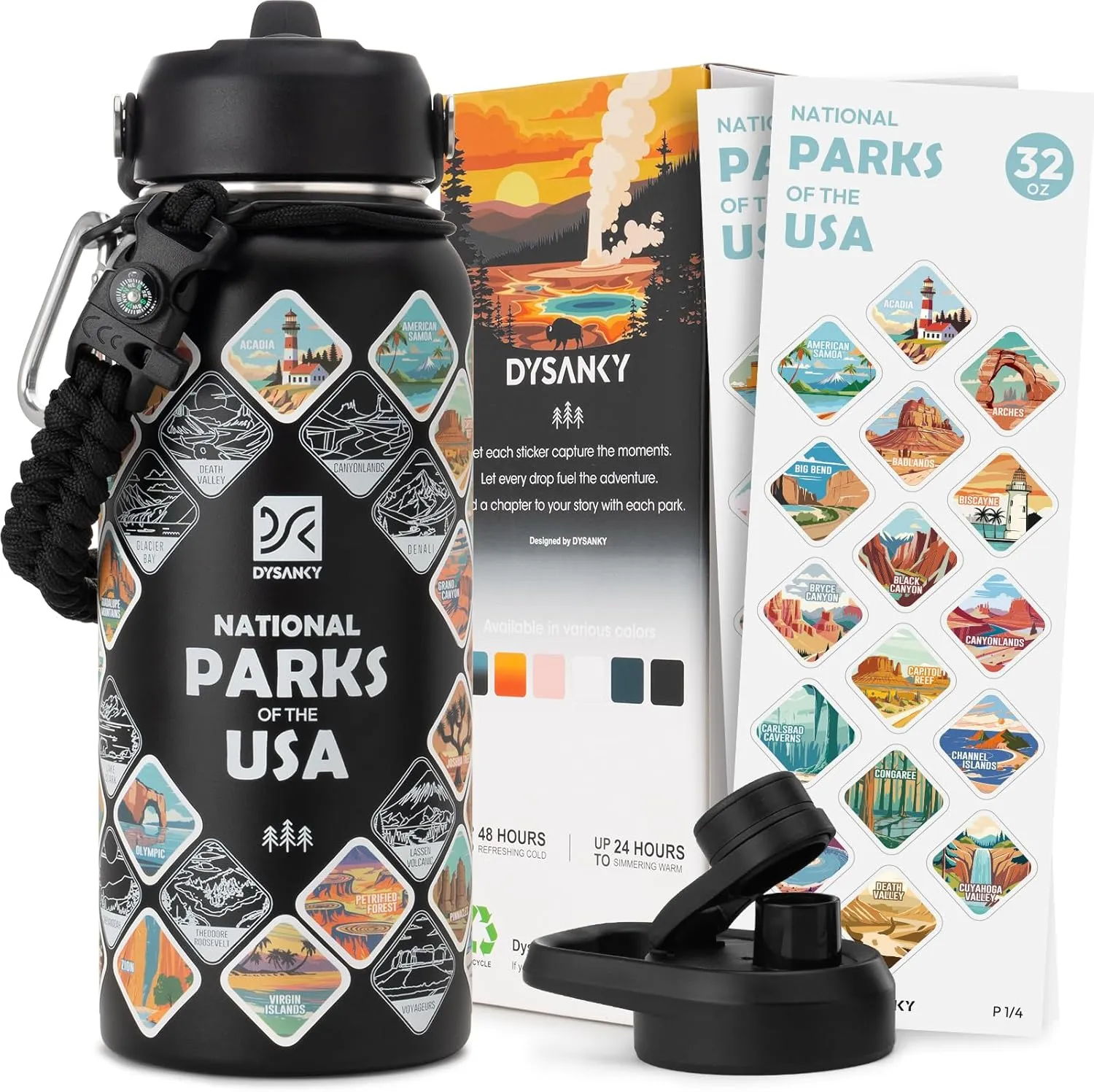 32oz vacuum-sealed bottle with 63 waterproof stickers. Official partner of the National Parks Conservation Association.