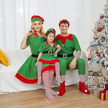 This matching family set includes tops, dress, pants, hat, belt, and socks in coordinating Christmas designs. The elf costume theme works beautifully for families of all sizes, and the comfortable materials ensure everyone enjoys wearing them throughout the celebration. Excellent value for a complete family transformation.